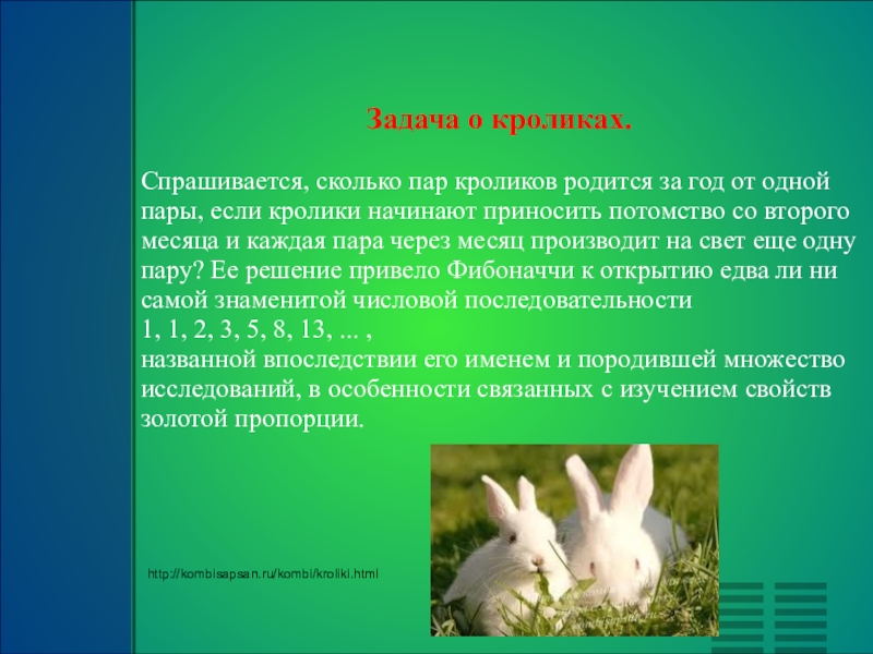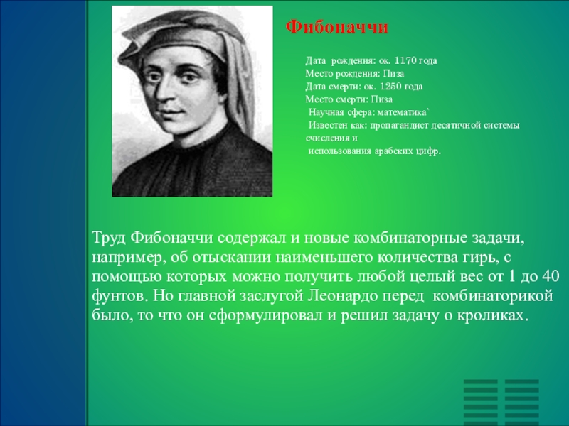 количества гирь, с помощью которых можно получить любой целый вес от 1 до 40 фунтов. Но главной заслугой Леонардо перед комбинаторикой было, то что он сформулировал и решил задачу о кроликах.