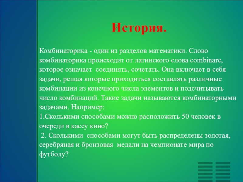 Комбинаторика - один из разделов математики. Слово комбинаторика происходит от латинского