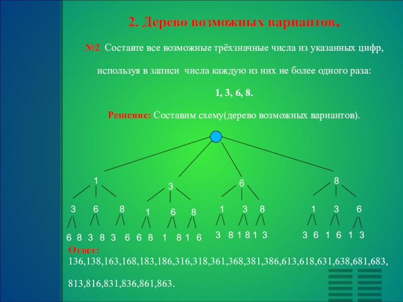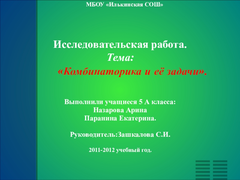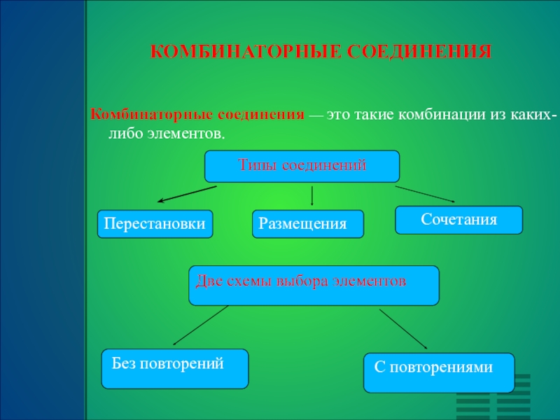 слова combinare, которое означает соединять, сочетать. Она включает в себя задачи, решая которые приходиться составлять различные комбинации из конечного числа элементов и подсчитывать число комбинаций. Такие задачи называются комбинаторными задачами. Например: