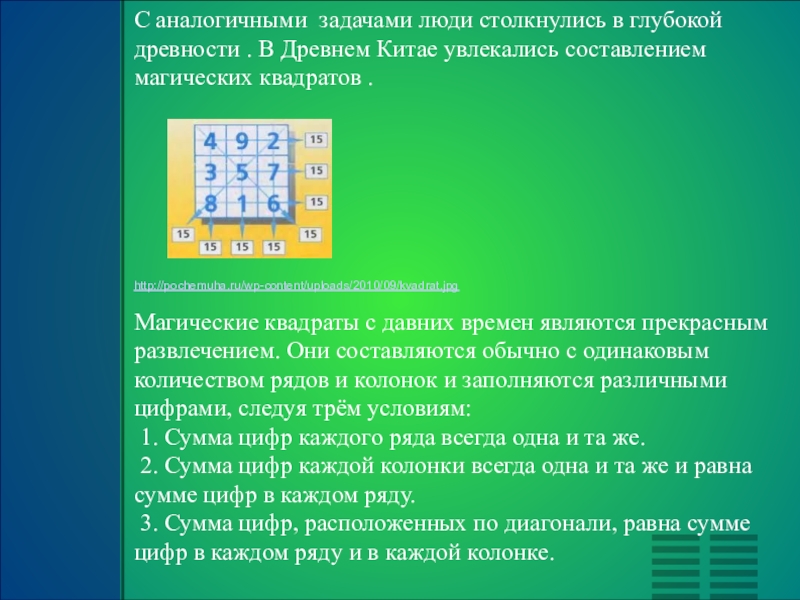 Магические квадраты с давних времен являются прекрасным развлечением. Они составляются обычно с одинаковым количеством рядов и колонок и заполняются различными цифрами, следуя трём условиям: