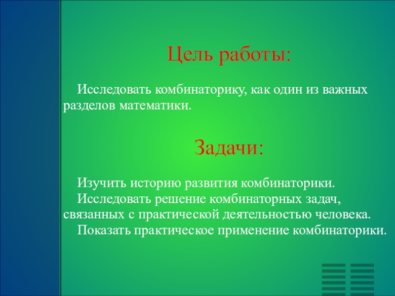 Исследовать решение комбинаторных задач, связанных с практической деятельностью человека.