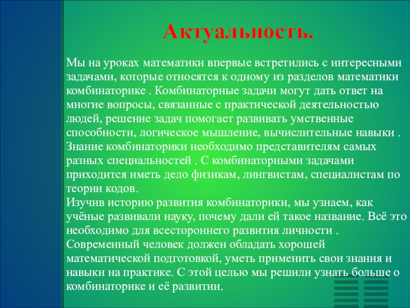 Изучив историю развития комбинаторики, мы узнаем, как учёные развивали науку, почему дали ей такое название. Всё это необходимо для всестороннего развития личности . Современный человек должен обладать хорошей математической подготовкой, уметь применить свои знания и навыки на практике. С этой целью мы решили узнать больше о комбинаторике и её развитии.