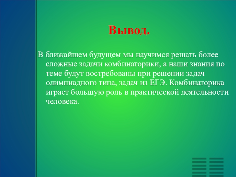 наши знания по теме будут востребованы при решении задач олимпиадного типа, задач из ЕГЭ. Комбинаторика играет большую роль в практической деятельности человека.