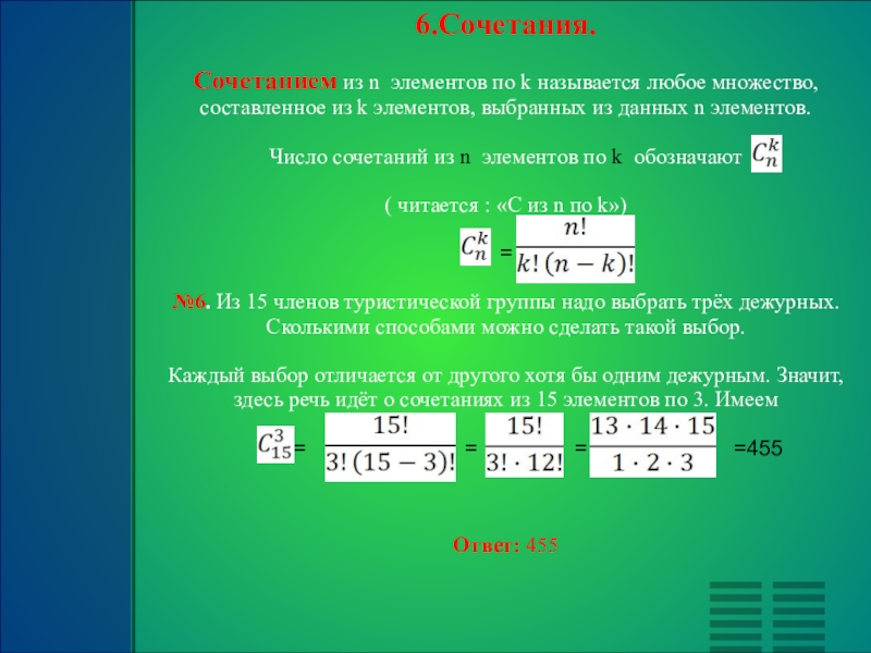 №6. Из 15 членов туристической группы надо выбрать трёх дежурных. Сколькими способами можно сделать такой выбор.