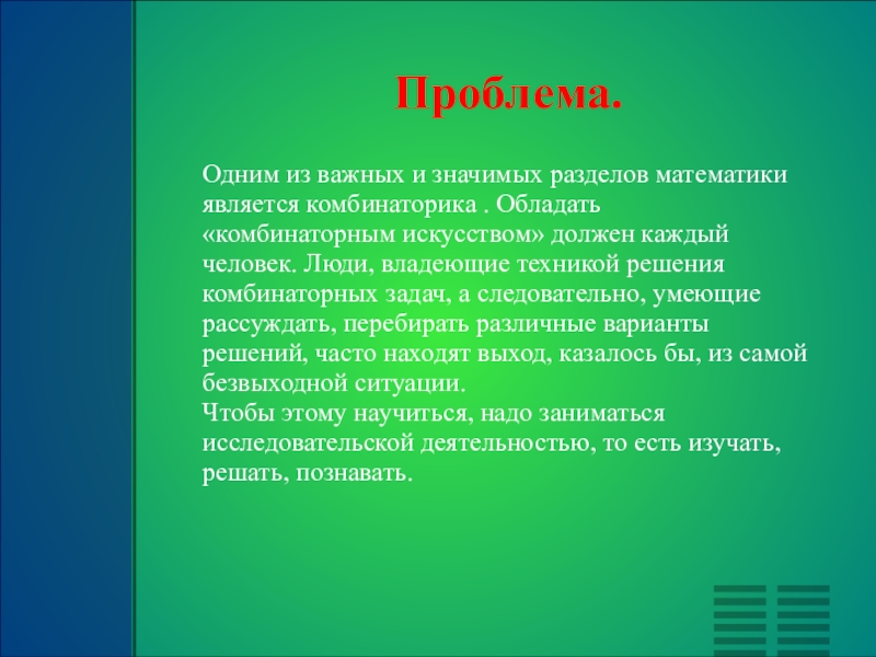 Одним из важных и значимых разделов математики является комбинаторика . Обладать