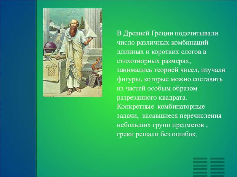 в стихотворных размерах, занимались теорией чисел, изучали фигуры, которые можно составить из частей особым образом разрезанного квадрата. Конкретные комбинаторные задачи, касавшиеся перечисления небольших групп предметов , греки решали без ошибок.