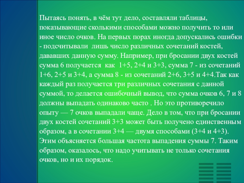 можно получить то или иное число очков. На первых порах иногда допускались ошибки - подсчитывали лишь число различных сочетаний костей, дававших данную сумму. Например, при бросании двух костей сумма 6 получается как 1+5, 2+4 и 3+3, сумма 7 - из сочетаний 1+6, 2+5 и 3+4, а сумма 8 - из сочетаний 2+6, 3+5 и 4+4.Так как каждый раз получается три различных сочетания с данной суммой, то делается ошибочный вывод, что сумма очков 6, 7 и 8 должны выпадать одинаково часто . Но это противоречило опыту — 7 очков выпадали чаще. Дело в том, что при бросании двух костей сочетаний 3+3 может быть получено единственным образом, а в сочетании 3+4 — двумя способами (3+4 и 4+3).Этим объясняется большая частота выпадения суммы 7. Таким образом, оказалось, что надо учитывать не только сочетания очков, но и их порядок.