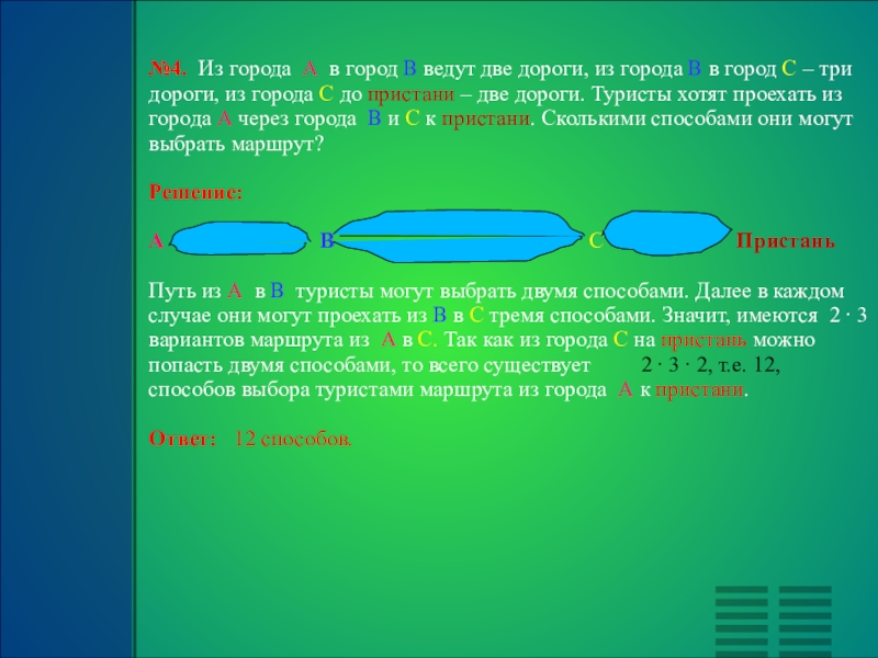 Путь из А в В туристы могут выбрать двумя способами. Далее в каждом случае они могут проехать из В в С тремя способами. Значит, имеются 2 ∙ 3 вариантов маршрута из А в С. Так как из города С на пристань можно попасть двумя способами, то всего существует 2 ∙ 3 ∙ 2, т.е. 12, способов выбора туристами маршрута из города А к пристани.