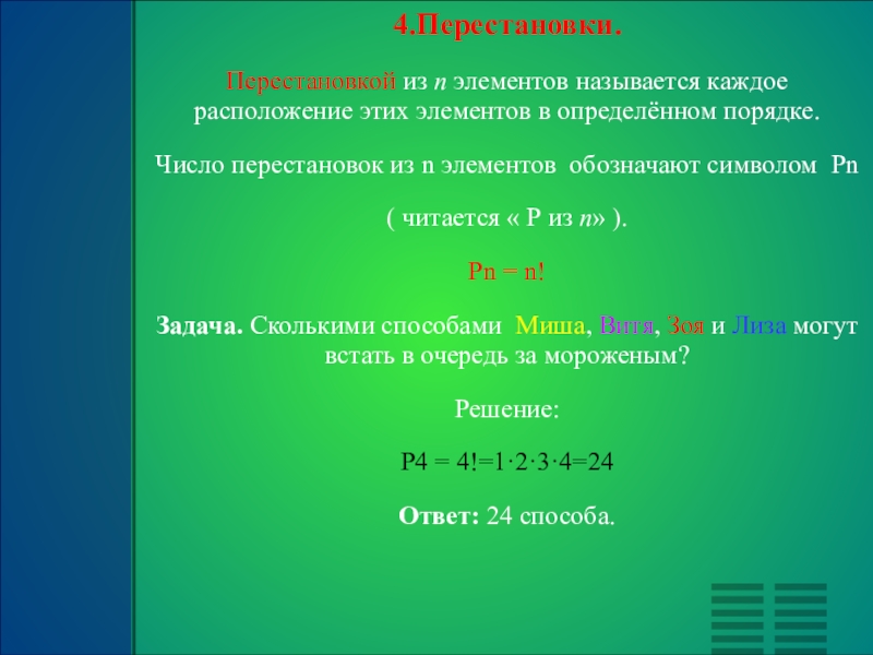 Задача. Сколькими способами Миша, Витя, Зоя и Лиза могут встать в очередь за мороженым?