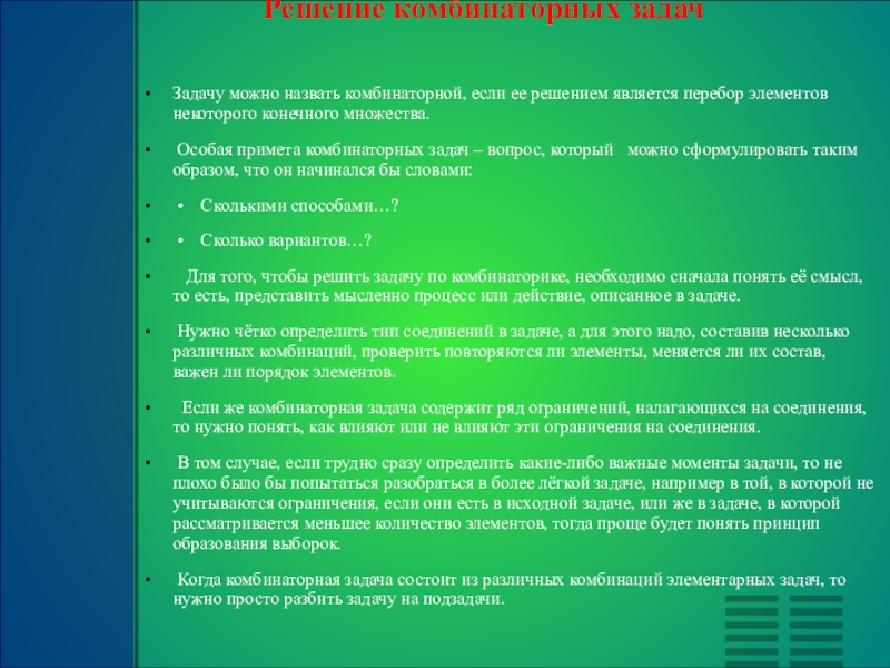 Решение комбинаторных задач. http://combinatoric.ru.gg/%26%231056%3B%26%231045%3B%26%231064%3B%26%231045%3B%26%231053%3B%26%231048%3B%26%231045%3B-%26%231050%3B%26%231054%3B%26%231052%3B%26%231041%3B%26%231048%3B%26%231053%3B%26%231040%3B%26%231058%3B%26%231054%3B%26%231056%3B%26%231053%3B%26%231067%3B%26%231061%3B-%26%231047%3B%26%231040%3B%26%231044%3B%26%231040%3B%26%231063%3B.htm