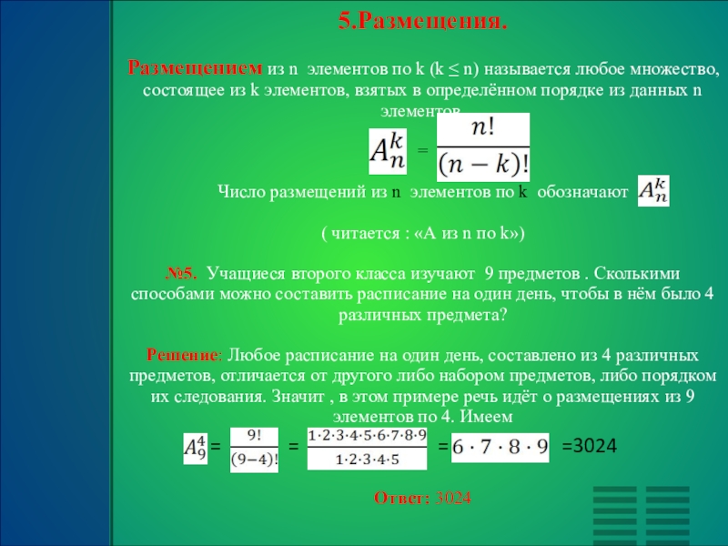 Решение: Любое расписание на один день, составлено из 4 различных предметов, отличается от другого либо набором предметов, либо порядком их следования. Значит , в этом примере речь идёт о размещениях из 9 элементов по 4. Имеем