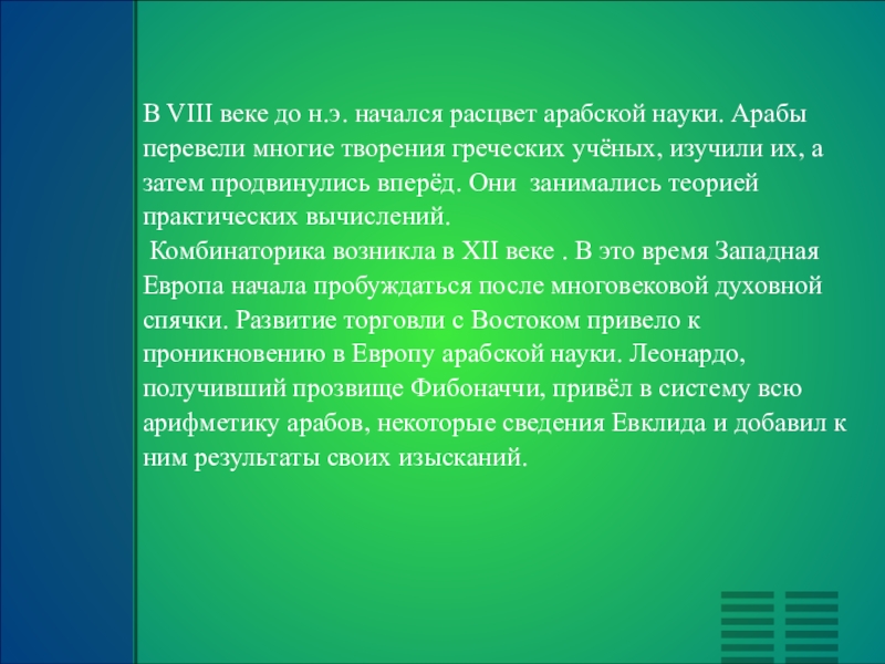 многие творения греческих учёных, изучили их, а затем продвинулись вперёд. Они занимались теорией практических вычислений.