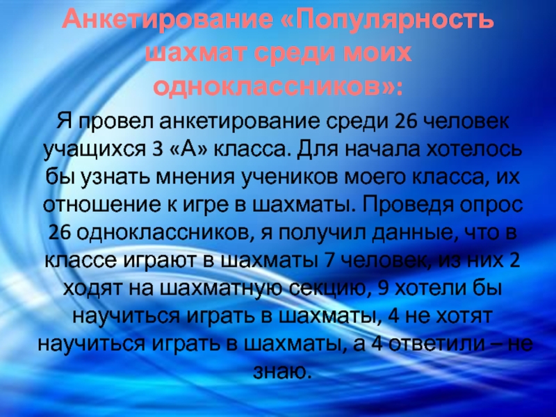 Слайд 20Анкетирование «Популярность шахмат среди моих одноклассников»: