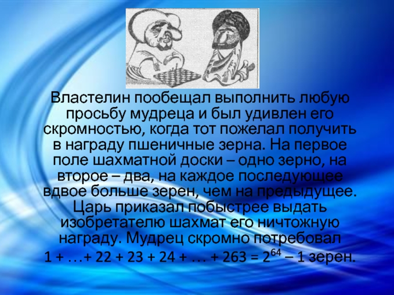 когда тот пожелал получить в награду пшеничные зерна. На первое поле шахматной доски – одно зерно, на второе – два, на каждое последующее вдвое больше зерен, чем на предыдущее. Царь приказал побыстрее выдать изобретателю шахмат его ничтожную награду. Мудрец скромно потребовал