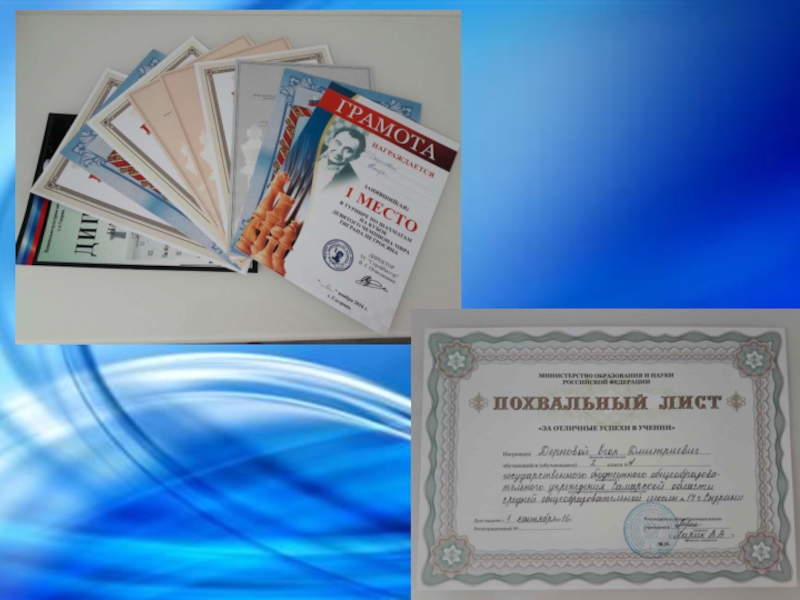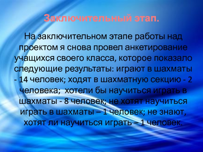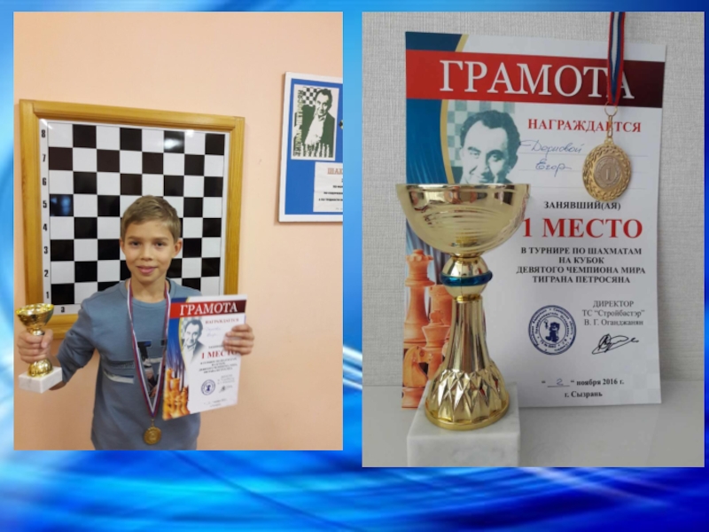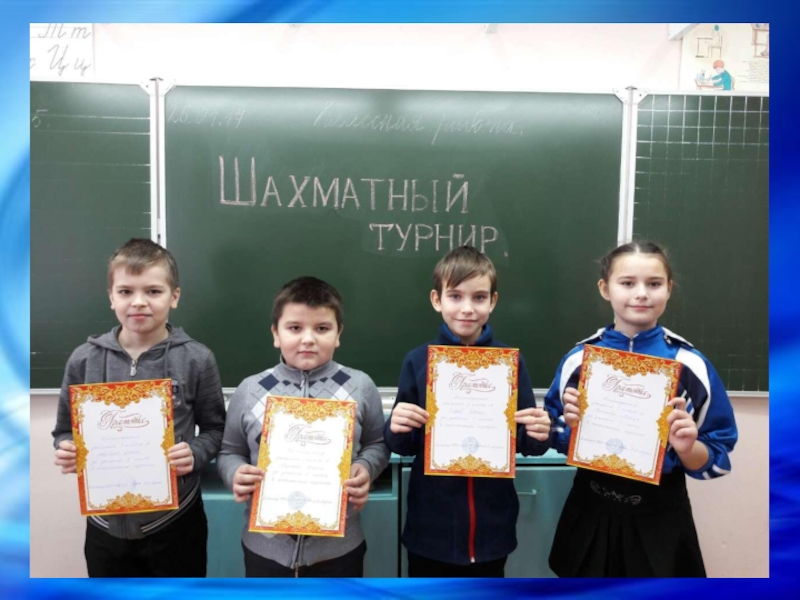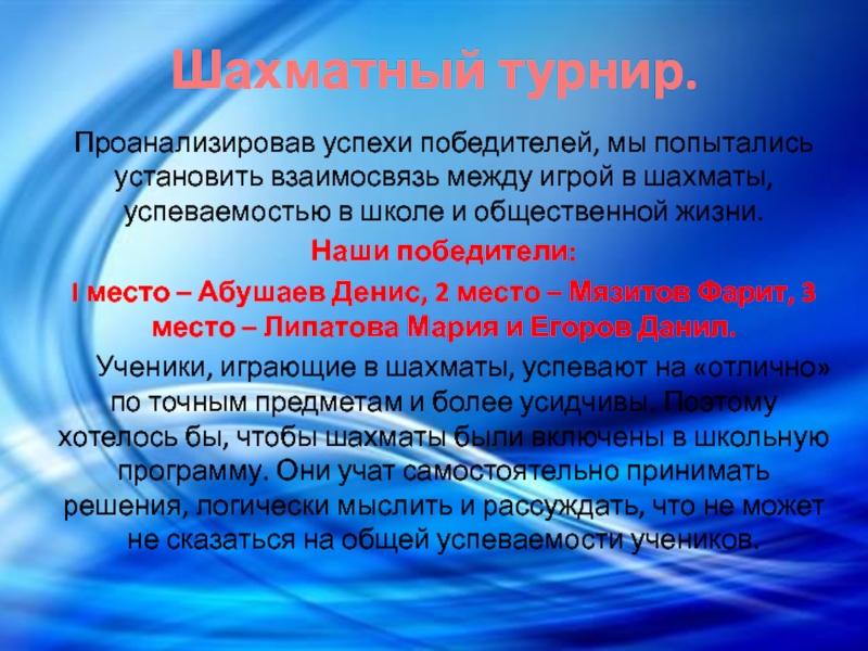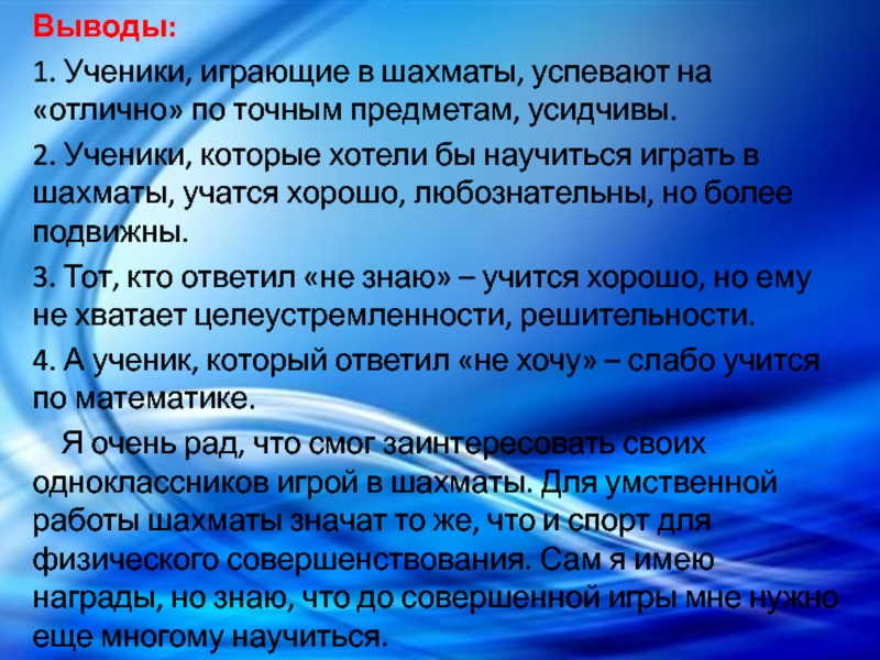 Я очень рад, что смог заинтересовать своих одноклассников игрой в шахматы. Для умственной работы шахматы значат то же, что и спорт для физического совершенствования. Сам я имею награды, но знаю, что до совершенной игры мне нужно еще многому научиться.