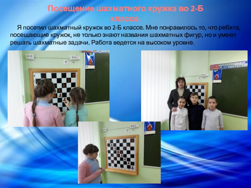 кружок во 2-Б классе. Мне понравилось то, что ребята, посещающие кружок, не только знают названия шахматных фигур, но и умеют решать шахматные задачи. Работа ведется на высоком уровне.