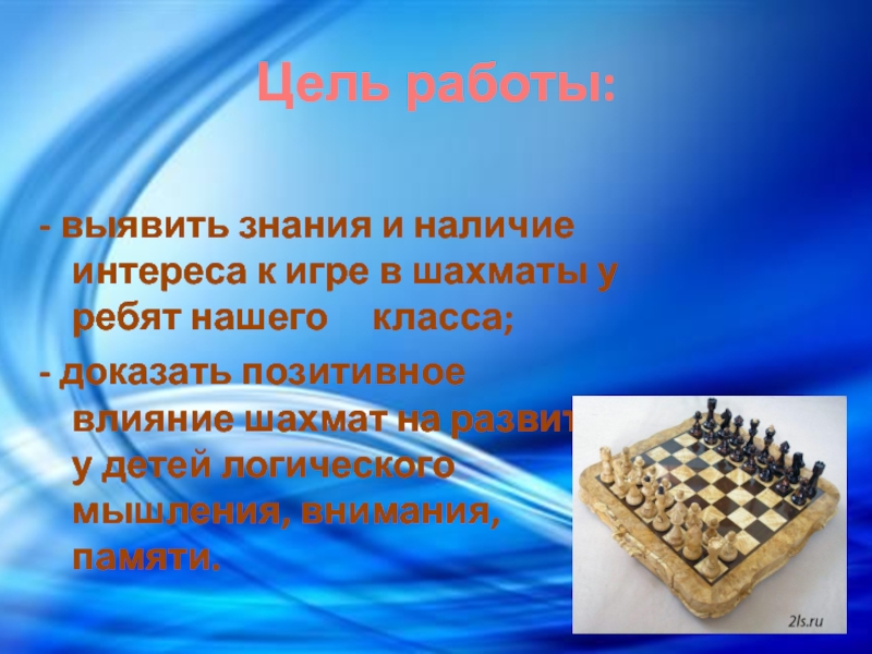 - доказать позитивное влияние шахмат на развитие у детей логического мышления, внимания, памяти.
