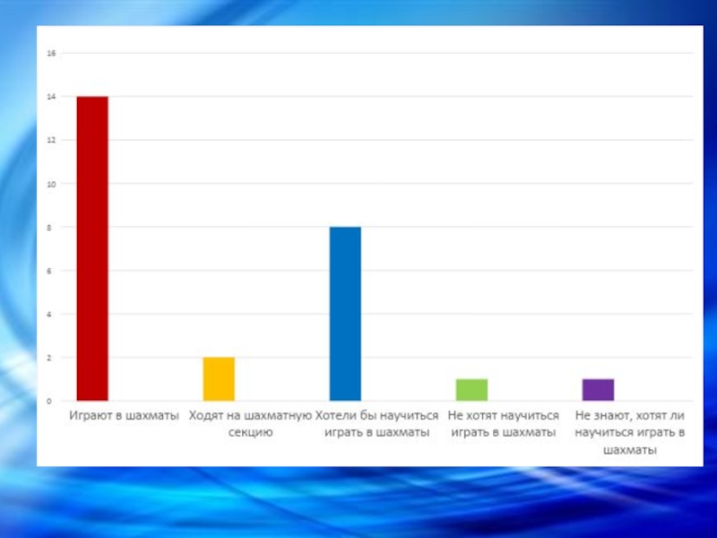учащихся своего класса, которое показало следующие результаты: играют в шахматы - 14 человек; ходят в шахматную секцию - 2 человека; хотели бы научиться играть в шахматы - 8 человек; не хотят научиться играть в шахматы – 1 человек; не знают, хотят ли научиться играть – 1 человек.