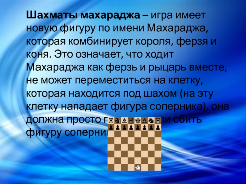 Слайд 16Шахматы махараджа – игра имеет новую фигуру по имени Махараджа, которая комбинирует