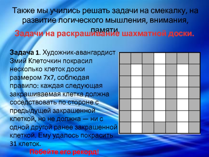 Слайд 24Также мы учились решать задачи на смекалку, на развитие логического мышления,
