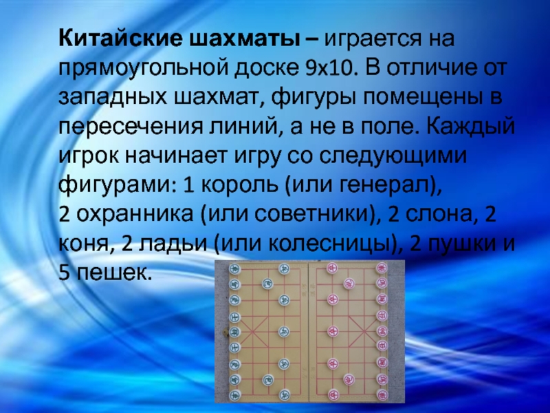 Слайд 19Китайские шахматы – играется на прямоугольной доске 9x10. В отличие от западных