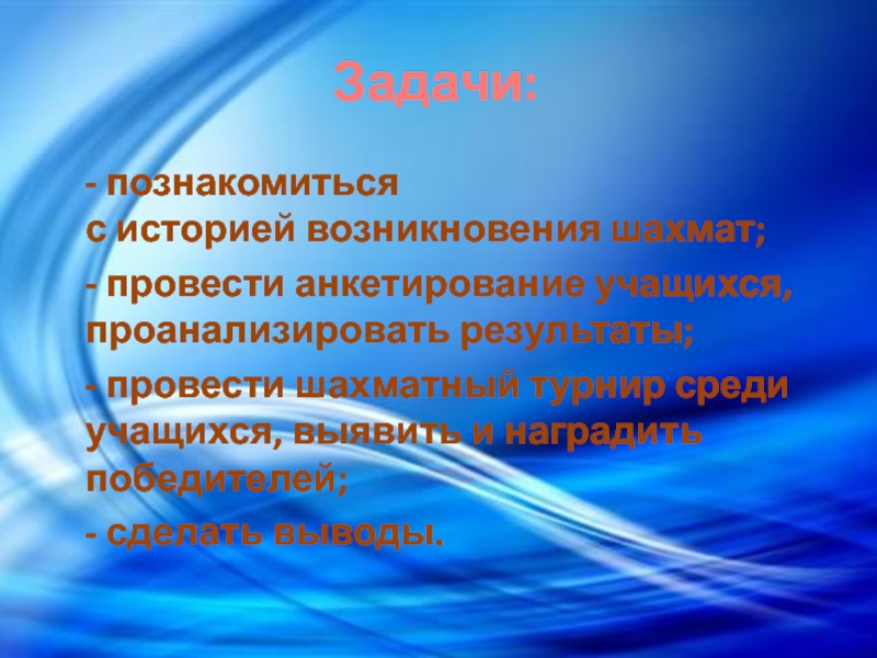 искал задачи с применением шахмат, проводил анкетирование среди учащихся класса.