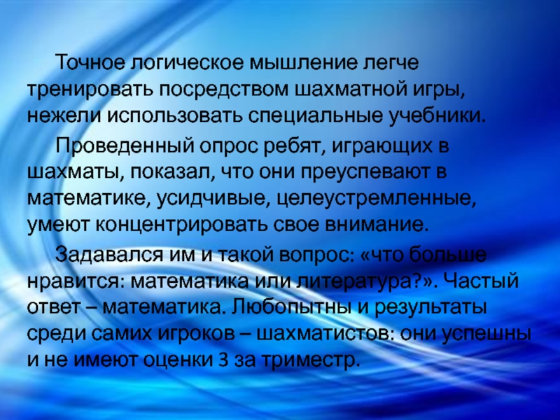 Слайд 31 Точное логическое мышление легче тренировать посредством шахматной игры, нежели использовать специальные