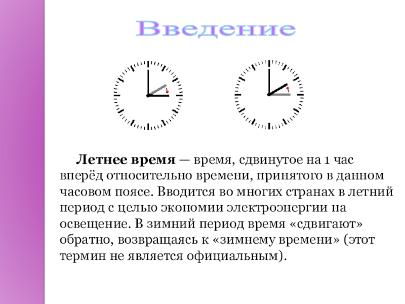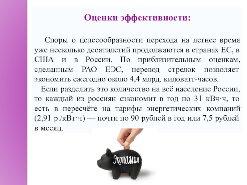 несколько десятилетий продолжаются в странах ЕС, в США и в России. По приблизительным оценкам, сделанным РАО ЕЭС, перевод стрелок позволяет экономить ежегодно около 4,4 млрд. киловатт-часов.