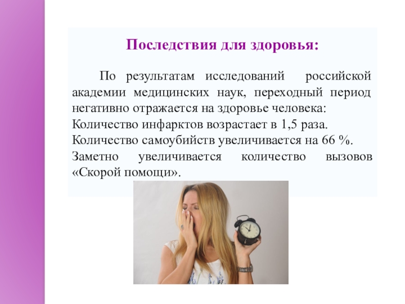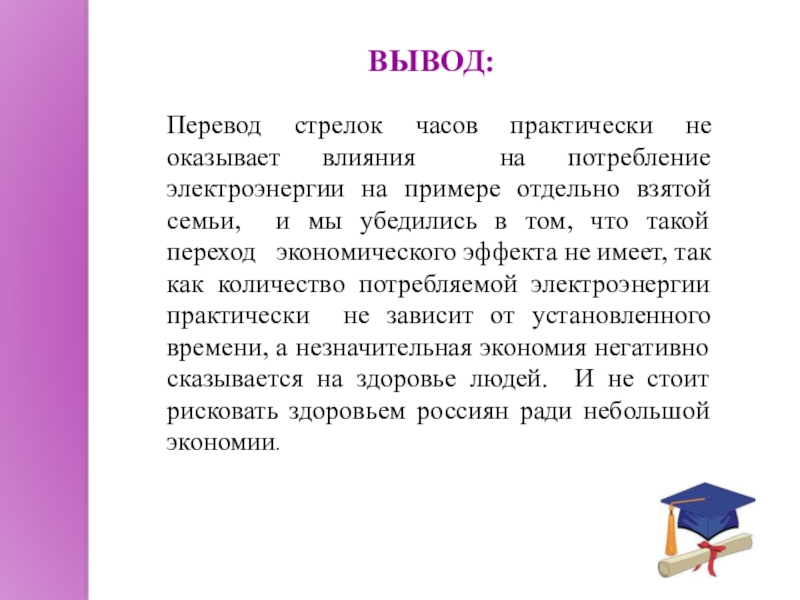 примере отдельно взятой семьи, и мы убедились в том, что такой переход экономического эффекта не имеет, так как количество потребляемой электроэнергии практически не зависит от установленного времени, а незначительная экономия негативно сказывается на здоровье людей. И не стоит рисковать здоровьем россиян ради небольшой экономии.