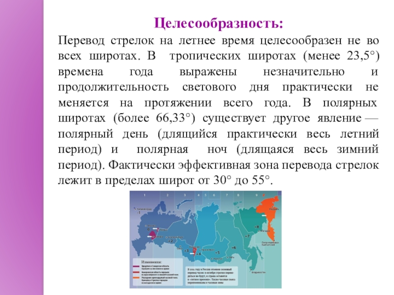тропических широтах (менее 23,5°) времена года выражены незначительно и продолжительность светового дня практически не меняется на протяжении всего года. В полярных широтах (более 66,33°) существует другое явление — полярный день (длящийся практически весь летний период) и полярная ноч (длящаяся весь зимний период). Фактически эффективная зона перевода стрелок лежит в пределах широт от 30° до 55°.