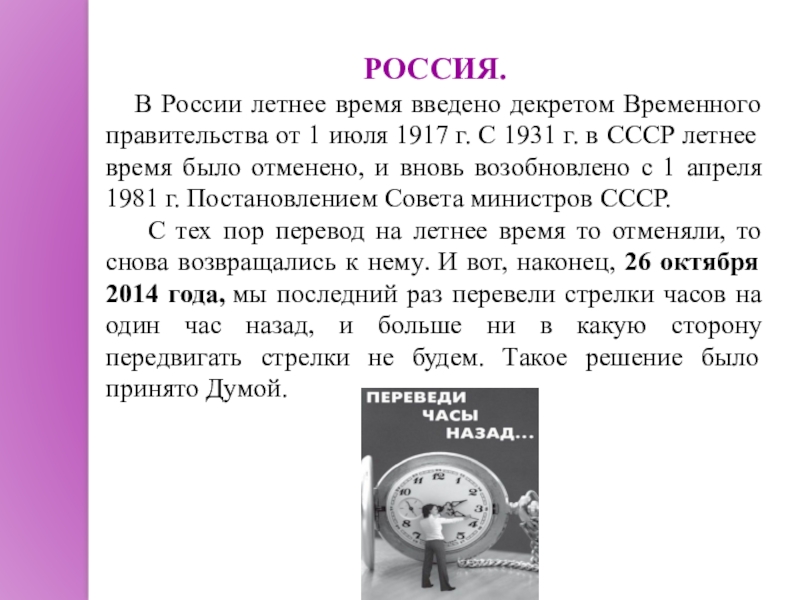 В России летнее время введено декретом Временного правительства от 1 июля 1917 г. С 1931 г. в СССР летнее время было отменено, и вновь возобновлено с 1 апреля 1981 г. Постановлением Совета министров СССР.