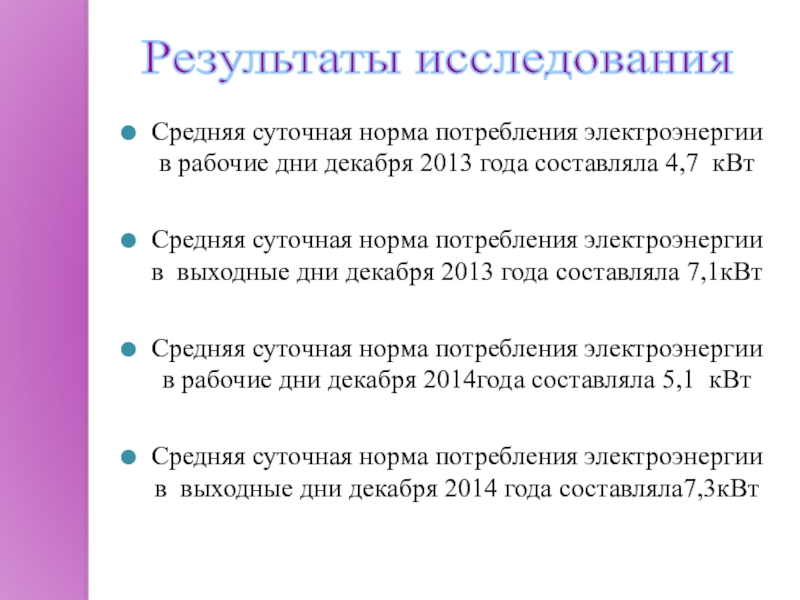 Средняя суточная норма потребления электроэнергии в выходные дни декабря 2013 года составляла 7,1кВт