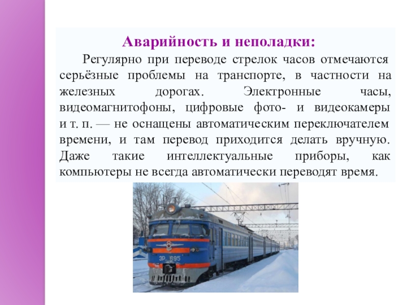 Регулярно при переводе стрелок часов отмечаются серьёзные проблемы на транспорте, в частности на железных дорогах. Электронные часы, видеомагнитофоны, цифровые фото- и видеокамеры и т. п. — не оснащены автоматическим переключателем времени, и там перевод приходится делать вручную. Даже такие интеллектуальные приборы, как компьютеры не всегда автоматически переводят время.