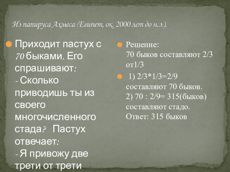 1) 2/3*1/3=2/9 составляют 70 быков. 2) 70 : 2/9= 315(быков) составляют стадо. Ответ: 315 быков