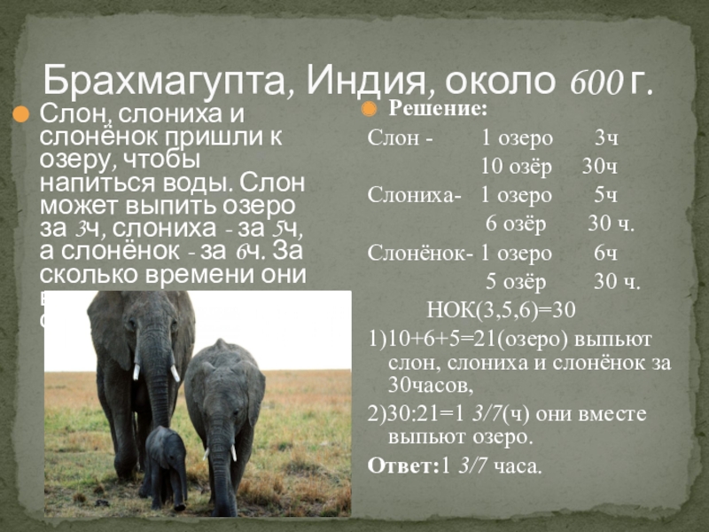 1)10+6+5=21(озеро) выпьют слон, слониха и слонёнок за 30часов,