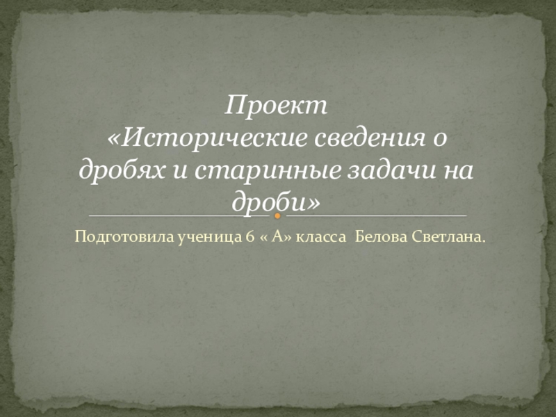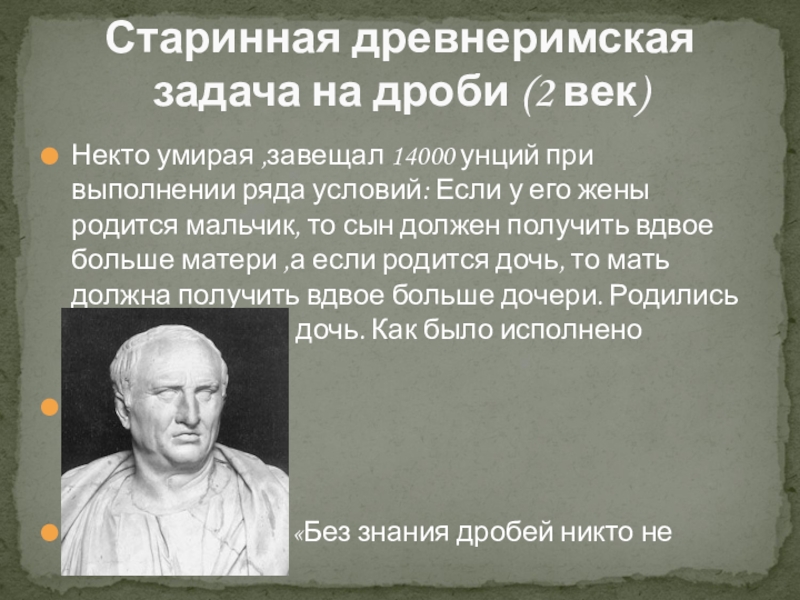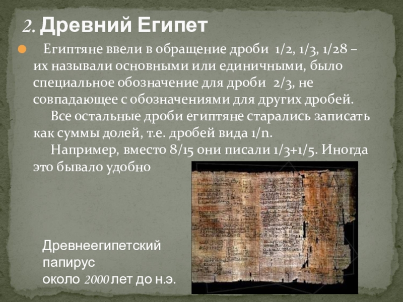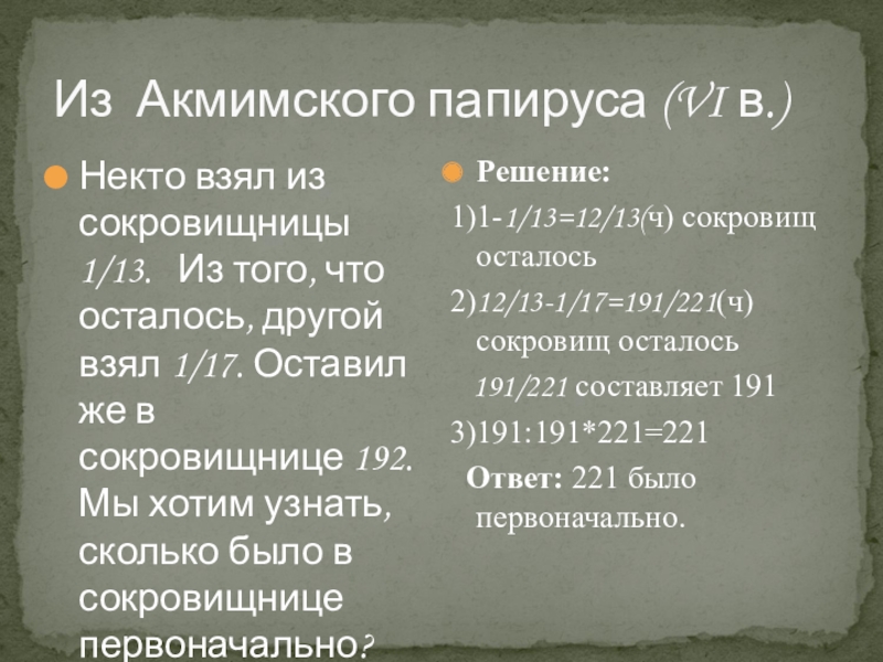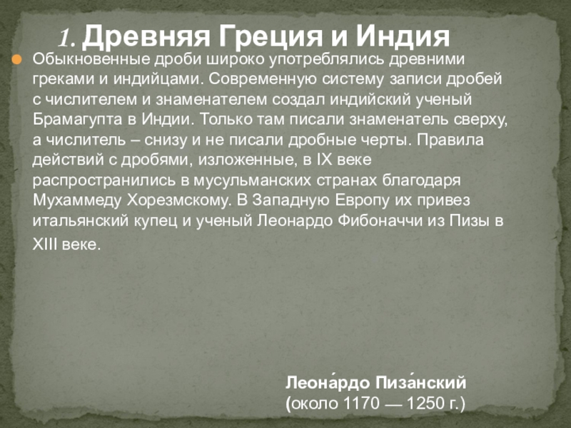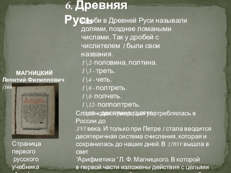 Дроби в Древней Руси называли долями, позднее ломаными числами. Так у дробей с числителем 1 были свои названия.