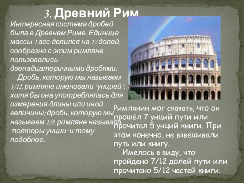 Римлянин мог сказать, что он прошёл 7 унций пути или прочитал 5 унций книги. При этом конечно, не взвешивали путь или книгу.