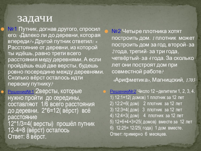 Решение№2 Число 12 –делители 1, 2, 3, 4. 1) 12:1=12( домов) 1 плотник за 12 лет 2) 12:2=6( дом) 2 плотник за 12 лет 3) 12:3=4( дом) 3 плотник за 12 лет 4) 12:4=3( дом) 4 плотник за 12 лет 5) 12+6+4+3=25( домов) вместе за 12 лет 6) 12:25= 12/25( года) 1 дом вместе. Ответ: примерно 6 месяцев.