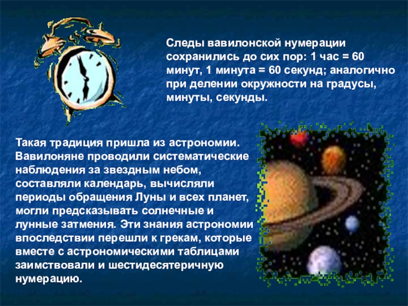 Такая традиция пришла из астрономии. Вавилоняне проводили систематические наблюдения за звездным небом, составляли календарь, вычисляли периоды обращения Луны и всех планет, могли предсказывать солнечные и лунные затмения. Эти знания астрономии впоследствии перешли к грекам, которые вместе с астрономическими таблицами заимствовали и шестидесятеричную нумерацию.