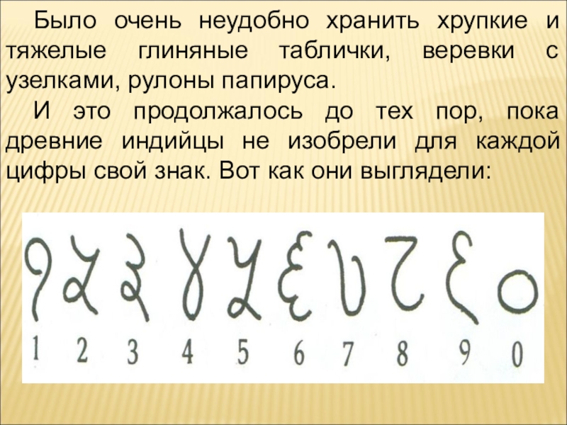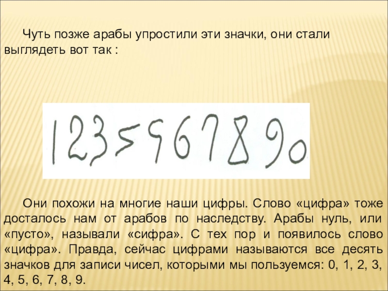 Они похожи на многие наши цифры. Слово «цифра» тоже досталось нам от арабов по наследству. Арабы нуль, или «пусто», называли «сифра». С тех пор и появилось слово «цифра». Правда, сейчас цифрами называются все десять значков для записи чисел, которыми мы пользуемся: 0, 1, 2, 3, 4, 5, 6, 7, 8, 9.