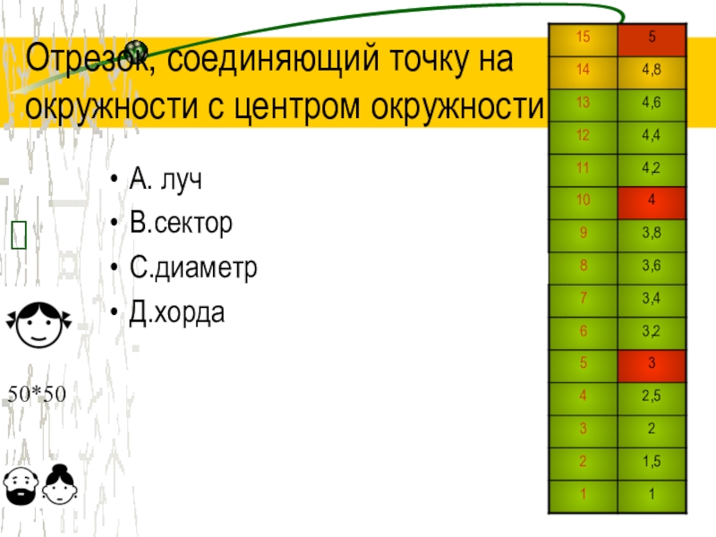 Отрезок, соединяющий точку на окружности с центром окружностиА. лучВ.секторС.диаметрД.хорда?50*50