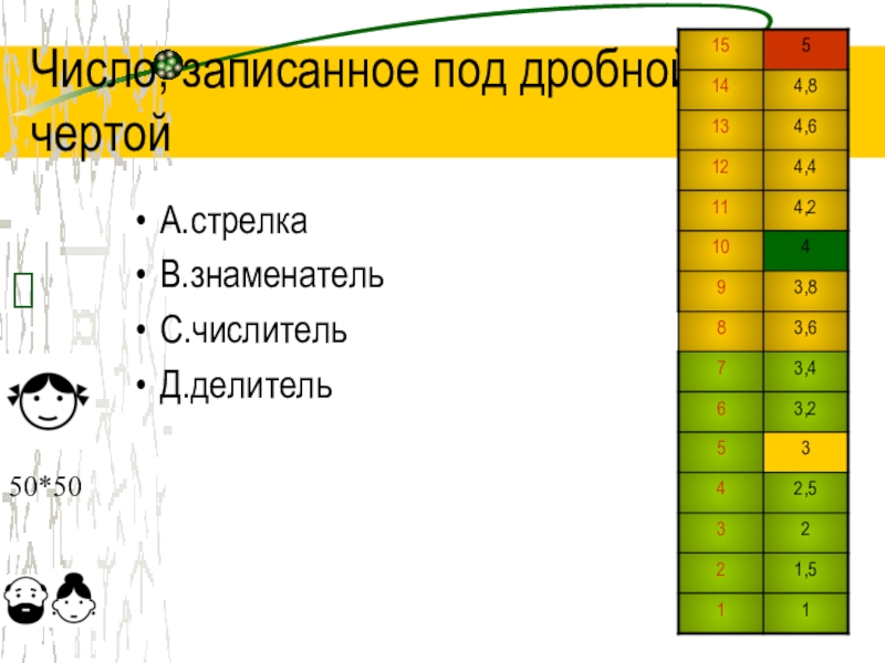 Число, записанное под дробной чертойА.стрелкаВ.знаменательС.числительД.делитель?50*50