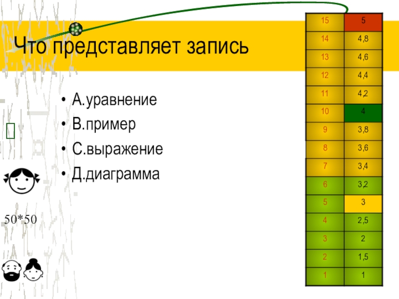 Что представляет записьА.уравнениеВ.примерС.выражениеД.диаграмма?50*50