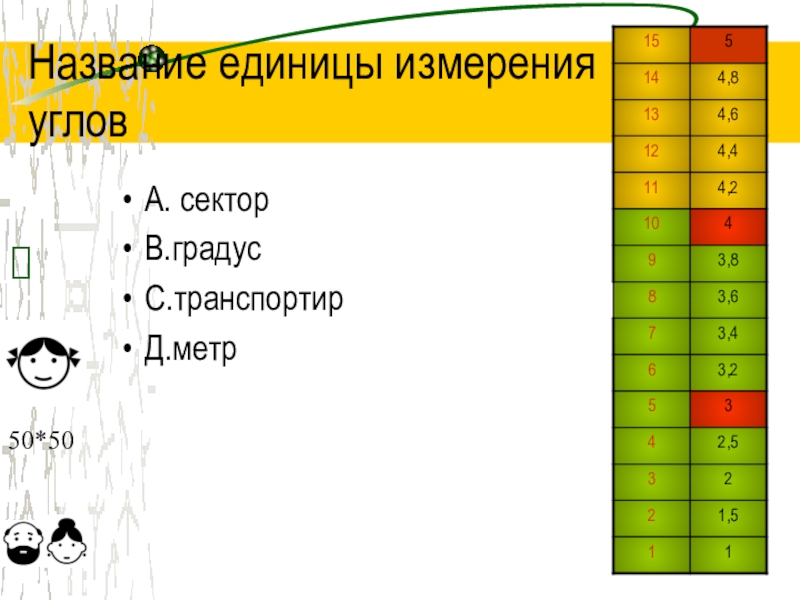 Название единицы измерения угловА. секторВ.градусС.транспортирД.метр?50*50