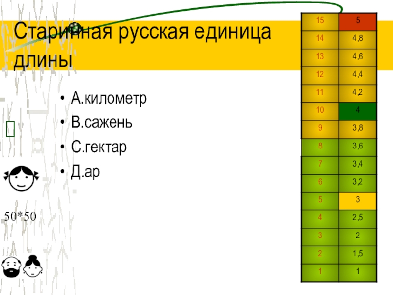 Старинная русская единица  длиныА.километрВ.саженьС.гектарД.ар?50*50