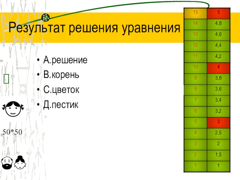 Результат решения уравненияА.решениеВ.кореньС.цветокД.пестик?50*50