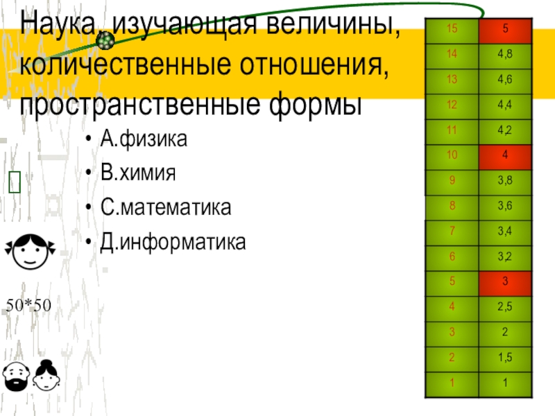 Наука, изучающая величины, количественные отношения,  пространственные формыА.физикаВ.химияС.математикаД.информатика?50*50