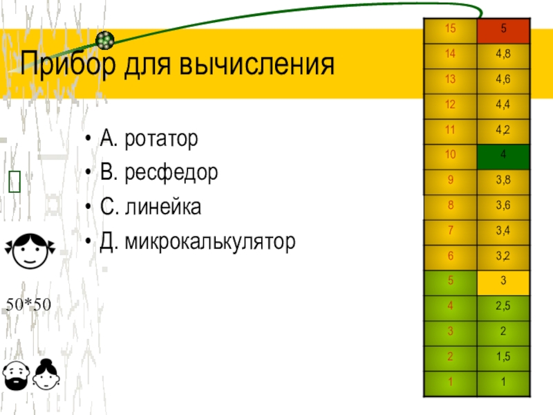 Прибор для вычисленияА. ротаторВ. ресфедорС. линейкаД. микрокалькулятор?50*50