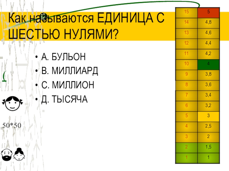 Как называются ЕДИНИЦА С ШЕСТЬЮ НУЛЯМИ?А. БУЛЬОНВ. МИЛЛИАРДС. МИЛЛИОНД. ТЫСЯЧА(50*50