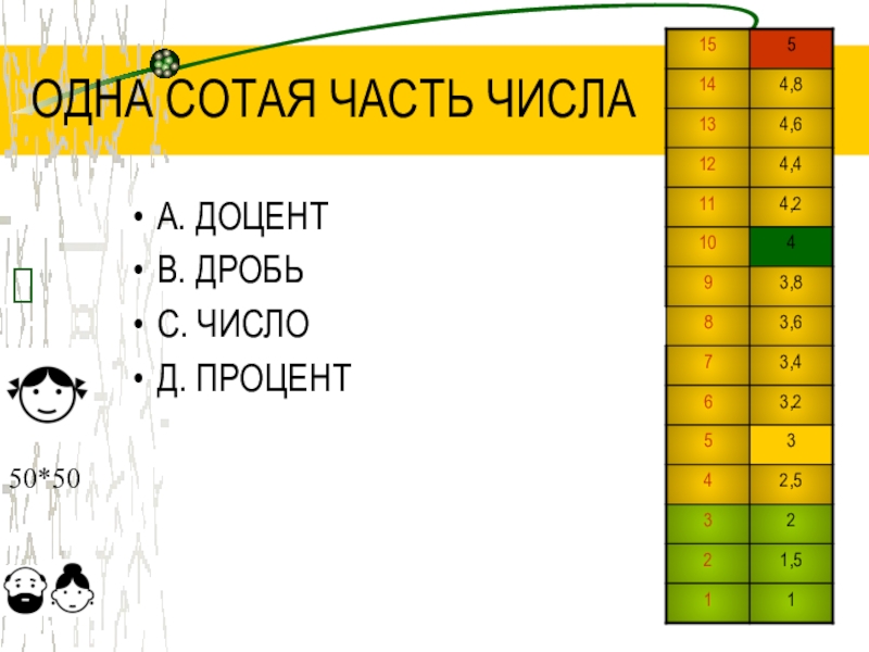 ОДНА СОТАЯ ЧАСТЬ ЧИСЛА А. ДОЦЕНТВ. ДРОБЬС. ЧИСЛОД. ПРОЦЕНТ?50*50